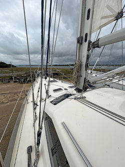 Hand laid up GRP. Sandwich type construction using balsa core stiffening, with plywood in high stress areas where fittings are positioned. Heavily stressed areas are additionally reinforced with unidirectional glass reinforcement. The deck is bonded to the hull through the entire length and to all main bulkheads resulting in a strong and integrated unit. Teak capping rail to hull to deck joint upstand. Access to chain locker from foredeck.