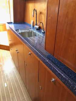 Interior joinery is finished in solid American Cherry and marine faced quality plywood as standard. Galley worktop in corian type material, Pebble Blue